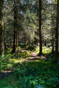 Après quelques centaines de mètres le long de la route, nous tournons à droite pour nous enfoncer dans la forêt. Le sentier, bien entretenu, serpente à travers une alternance de forêts de feuillus et de conifères. En saison,nous sommes tombé sur des myrtilles sauvages, prêtes à être cueillies. Elles sont encore un peu acidulées à cette époque de l’année, mais délicieuses pour une petite collation en chemin.